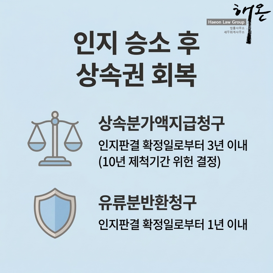 ② 단, 인지 판결 확정 전에 다른 공동상속인들이 이미 상속재산을 분할하거나 처분한 경우, 혼외자는 원물 반환을 요구할 수 없고 자신의 상속분에 상당한 가액의 지급만을 청구할 수 있습니다(민법 제1014조).